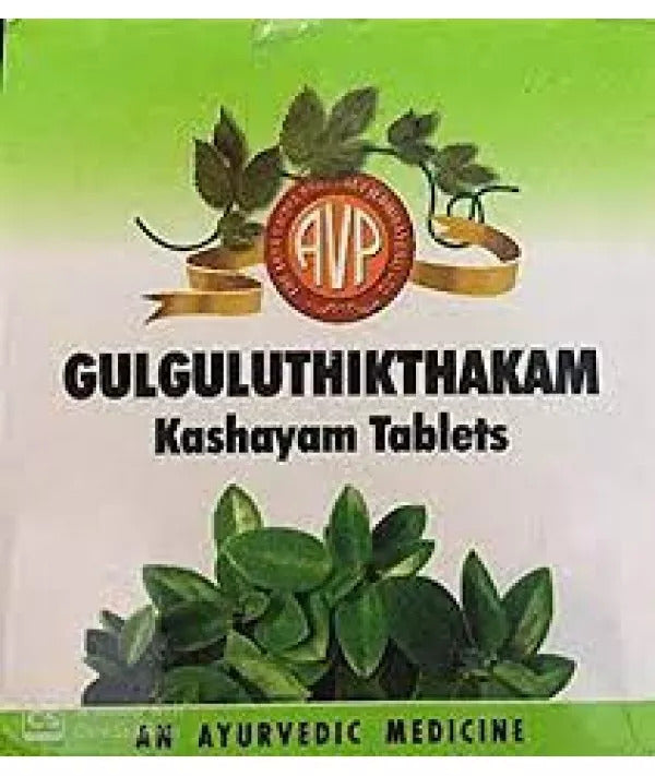 AVP Guggulutiktam Kashayam is an Ayurvedic medicine used in treating inflammatory conditions of skin, joints, and bones. It is in herbal decoction form. It is also available in Kashayam tablet form. For skin and joints problems it balances Vata and Kapha