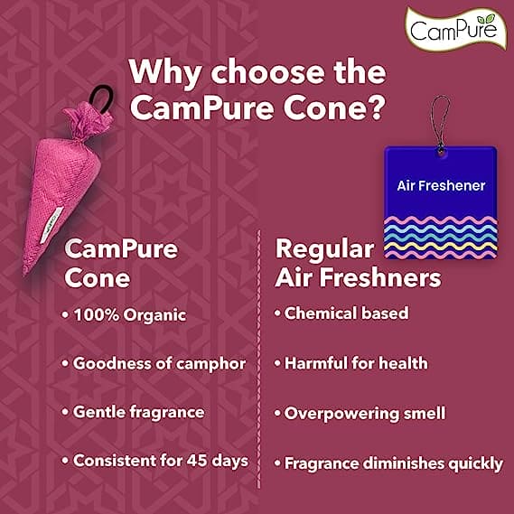 - NATURAL, ORGANIC, & ECO-FRIENDLY: CamPure Camphor Cone is made from an extract of the pine tree (also known as kapoor) and is therefore a NATURAL and ORGANIC product, making it safe around children and pets. Breathe easy knowing your family isn’t inhaling dangerous chemicals.