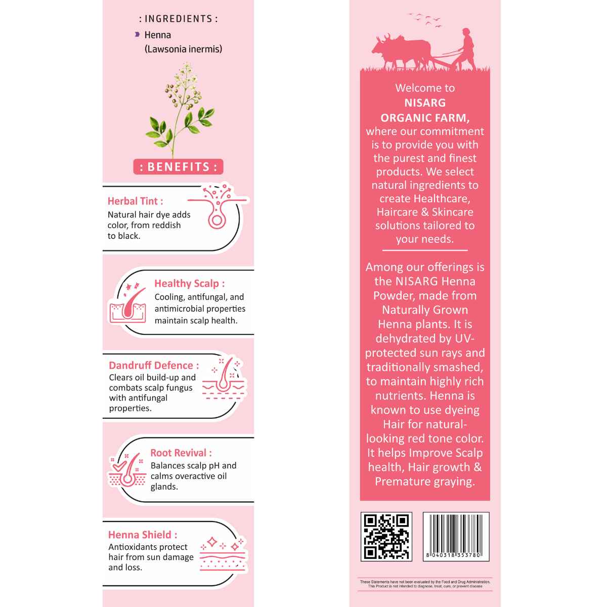 - Henna Powder: 100% pure, organically grown henna leaves, finely ground to perfection.