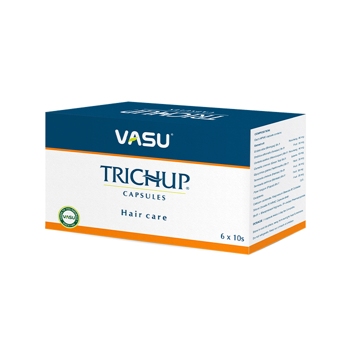 Trichup Capsule is a proprietary Ayurvedic medicine manufactured by Vasu Healthcare pharmaceuticals, Vadodara, Gujarat. Trichup capsule is used for hair growth, hair fall and dandruff. Trichup provides rich nutrition to hair follicles, encourages fresh growth, checks falling hair and dandruff.